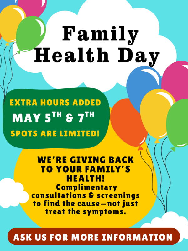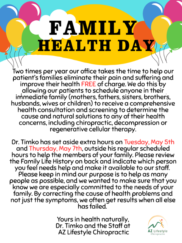 Twice a year, Dr Timko offers FREE health consultations and screenings for your immediate family members. Our goal is to help uncover the cause of health concerns—not just cover up symptoms. Extended hours added from Dr. Timko for TWO days ONLY!